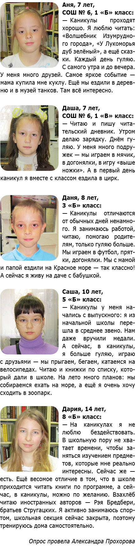 Уже почти месяц школьники района отдыхают. У них – каникулы. Чем же отличаются школьные будни от каникулярных? Где и как проводят летние денёчки малыши?