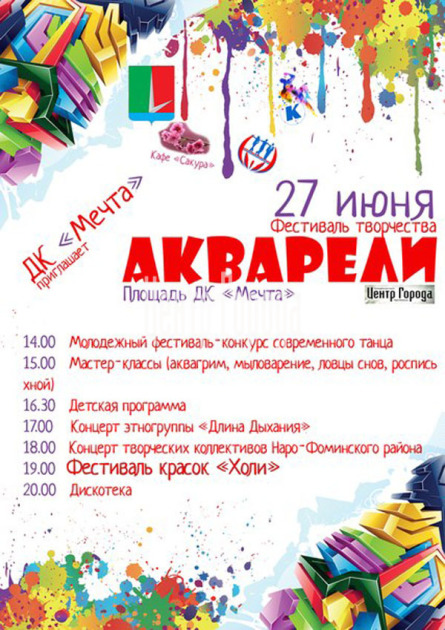 27 июня в Селятино на площади ДК «Мечта» состоится фестиваль «Акварели», посвященный Всероссийскому дню молодежи. Как и сама палитра акварели, праздник обещает быть ярким и разнообразным.